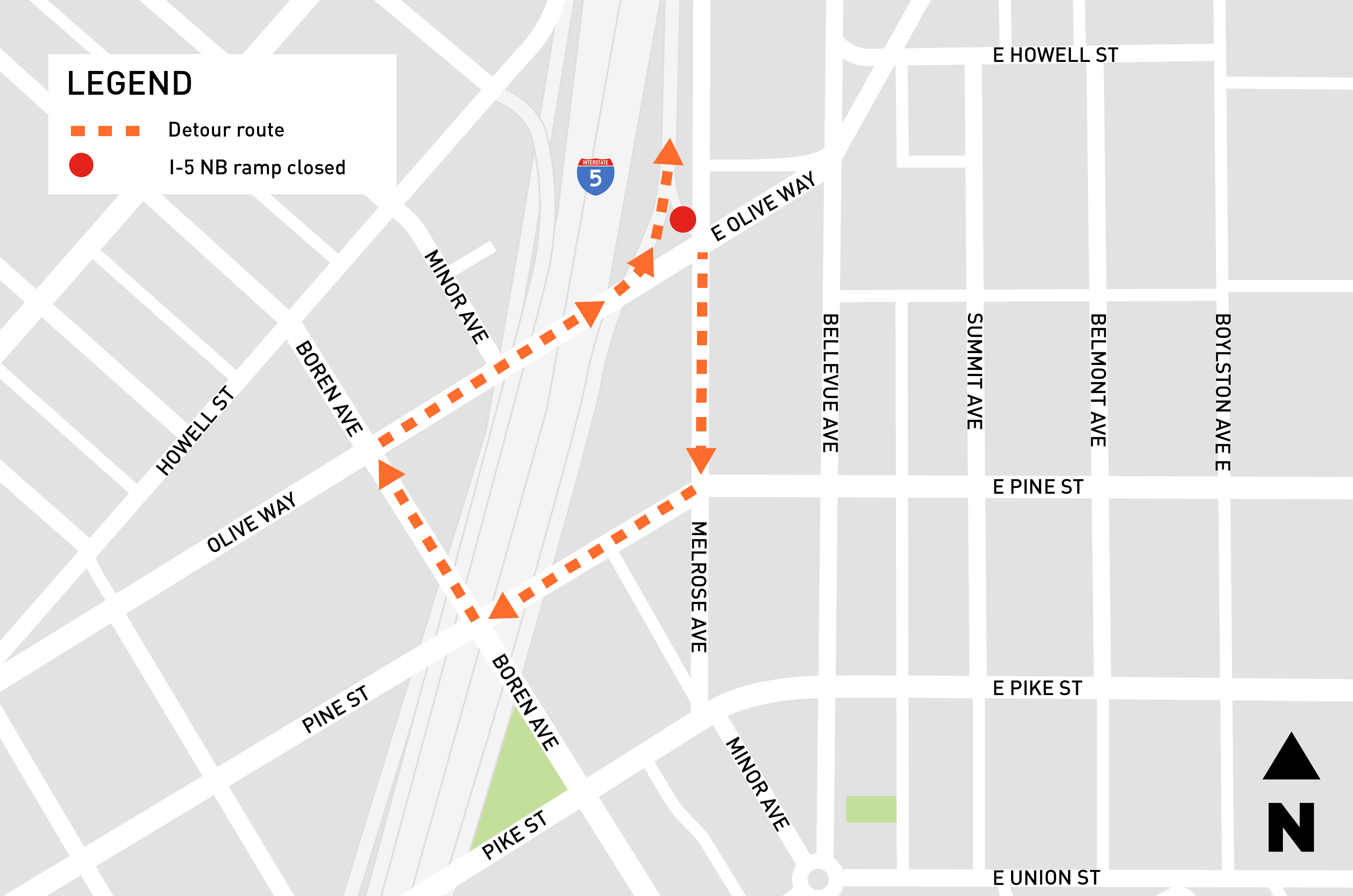 Temporary closure of the Melrose Ave access ramp to I-5 NB at Olive Way. Detour provided.