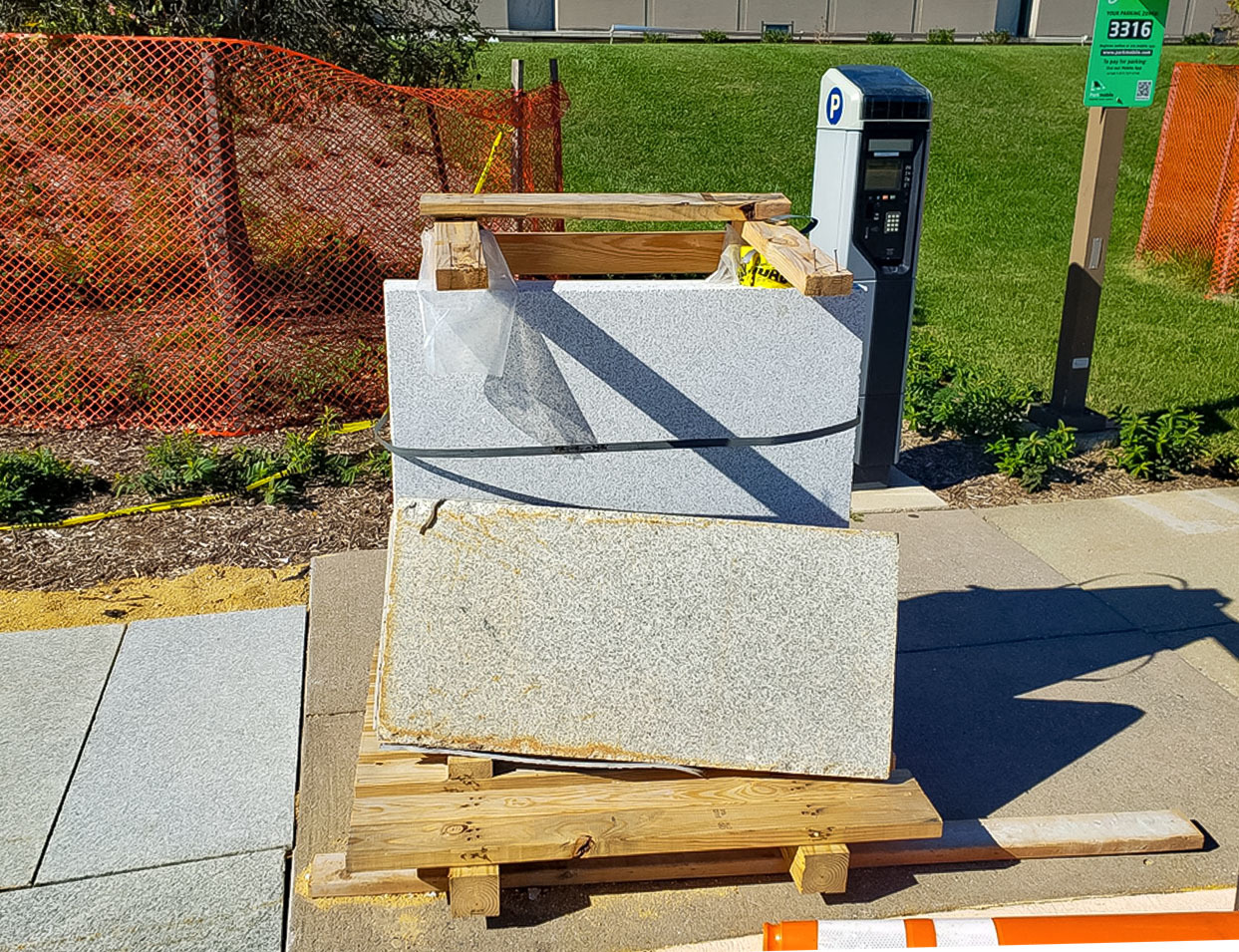 Building 38 front plaza improvements: Stonework is being leveled and replaced as needed; new handrails are being added.