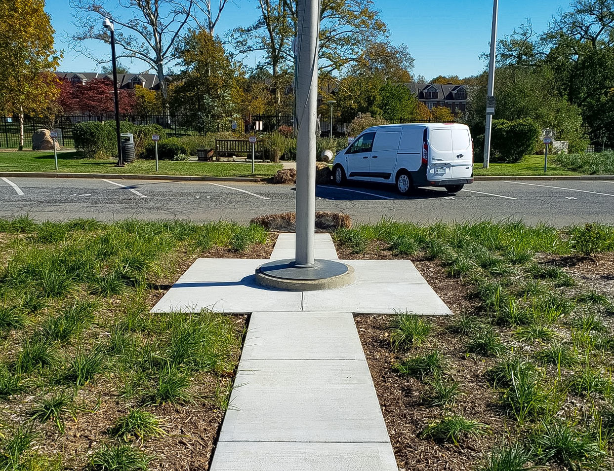 Building 38 front plaza improvements: Flagpole base has been repaired and repaved.
