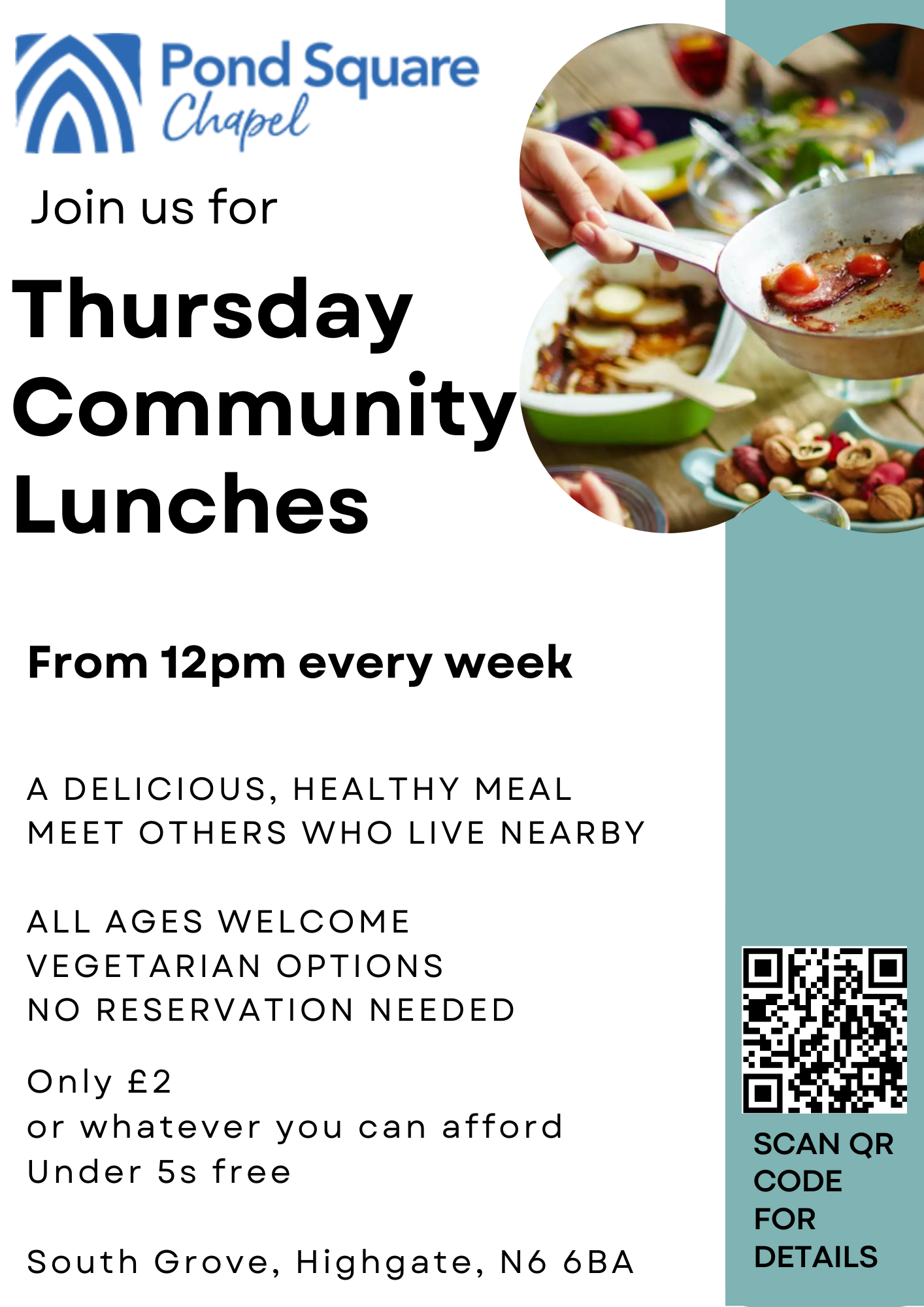 Pond Square Chapel holds Thursday Community Lunches from 12.00pm every Thursday.